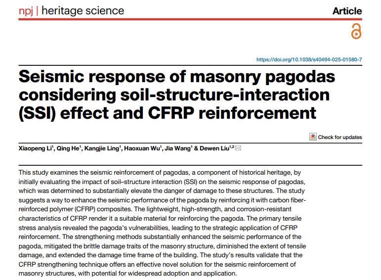 近日,2022级硕士研究生李小鹏以第一作者身份在中科院一区Top期刊《npj Heritage Science》发表“Seismic response of masonry pagodas considering soil-structure-interaction (SSI) effect and CFRP reinforcement”的高水平论文,该期刊为《自然》合作期刊npj系列,具有较高的学术声誉。